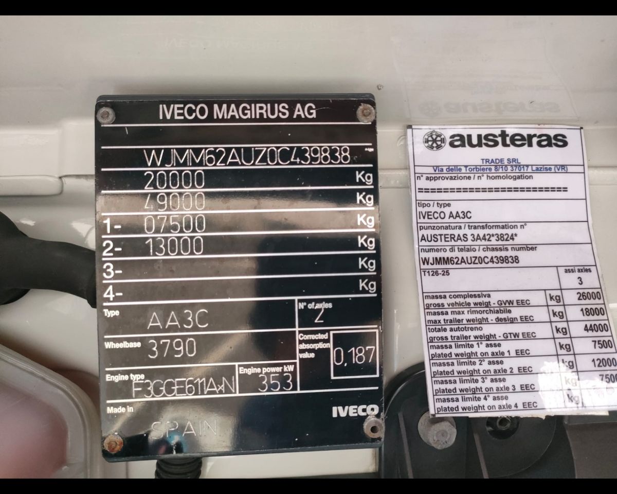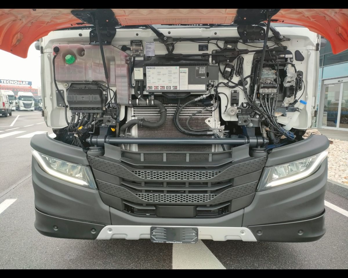 IVECO MOTRICE S-WAY AT260S48 Y/PS derivata da trasformazione di un trattore stradale, Km 370.265 immatricolazione 15/12/2020 passo 4200 revisione valida 11/2026 EURO 6, Cambio automatico ,Rallentatore idraulico intarder, Terzo asse sollevabile, sterzante, colore bianco, arancione, serbatoio 290lt dx, sedile guida gran confort ventilato riscaldato, cerchi in ferro, pneumatici 315/80r22,5, frigorifero, climatizzatore automatico, ve-connect, Due brandine, Cruise Control, Bloccaggio differenziale, Stacca-batteria.